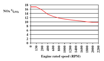 For engines less than 130RPM: 3.4g/kWh For Engines between 130 and 2000 rpm: 9 × n-0.2 g/kWh For engines above 2000 rpm: 2.0g/kWh