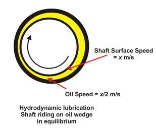 A sudden increase in speed or an external shock can cause the eccentricity of the shaft to increase from its equilibrium position. Oil is immediately pumped into the space vacated by the shaft which increases the pressure of the oil film, creating additional force between the oil film and shaft. The oil film now drives the shaft ahead of it in a forward circular motion within the bearing clearance. The frequency of the vibration set up by this whirling is just below 50% of shaft speed. Likelihood of oil whirl occurring after a disturbing force causes the shaft to move from equilibrium is increased by an excessive bearing clearance or oil at the wrong viscosity or pressure. Note: Tilting pad journal bearings (often used on prop shaft bearings) do not suffer from whirl.