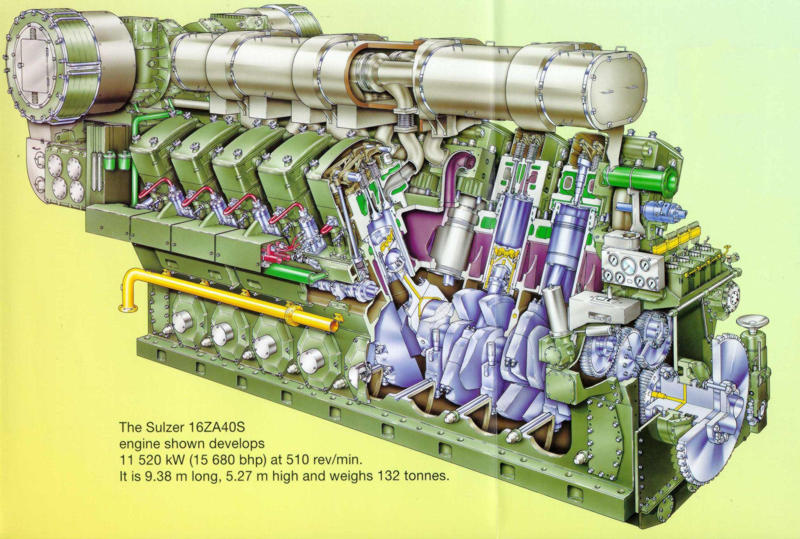 Bore: 640mm, Stroke: 900mm Speed: 330 RPM. Power output: 2010kW/cyl. Specific fuel consumption: 169g/kWh. Mass of 6 cyl engine: 237 tonnes, 12 cyl engine: 437 tonnes.