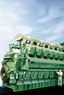 For sectioned pictures of these engines click HERE The name "Trunk Piston" refers to the piston skirt or trunk. The purpose of the skirt or trunk in four-stroke cycle engines is to act in a similar manner to a crosshead. It takes the thrust caused by connecting-rod angularity and transmits it to the side of the cylinder liner, in the same way as the crosshead slipper transmits the thrust to the crosshead guide. With such engines, which are termed trunk-piston engines, the engine height is considerably reduced compared with that of a crosshead engine of similar power and speed. The engine-manufacturing costs are also reduced. It means of course that there is no separation between the crankcase and the liner and piston. This has its disadvantages, especially when considering the choice of lubricating oils when burning high sulphur residual fuels. |