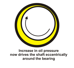A sudden increase in speed or an external shock can cause the eccentricity of the shaft to increase from its equilibrium position. Oil is immediately pumped into the space vacated by the shaft which increases the pressure of the oil film, creating additional force between the oil film and shaft. The oil film now drives the shaft ahead of it in a forward circular motion within the bearing clearance. The frequency of the vibration set up by this whirling is just below 50% of shaft speed. Likelihood of oil whirl occurring after a disturbing force causes the shaft to move from equilibrium is increased by an excessive bearing clearance or oil at the wrong viscosity or pressure. Note: Tilting pad journal bearings (often used on prop shaft bearings) do not suffer from whirl.