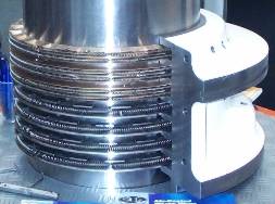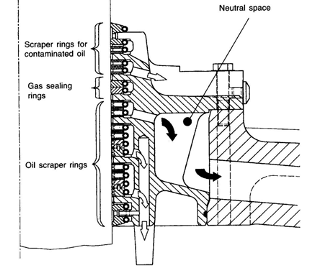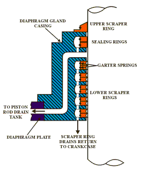 This photo of a split stuffing box showing the rings and springs was taken by Mr Dylan Wheel at the Ship Repair Exhibition at Olympia in Nov 2000. Thanks, Dylan Because the crankcase is separated from the cylinder and scavenge space by the diaphragm plate on a two stroke crosshead engine, provision must be made for the piston rod to pass through the plate without oil from the crankcase being carried upwards, or used cylinder oil contaminated from products of combustion being carried downwards. It is also highly undesirable to allow the pressurized air in the scavenge space to leak into the crankcase. The Piston rod passes through a stuffing box which is bolted into the diaphragm plate. The stuffing box casing which can be split vertically, as shown in the photo, contains a series of scraper rings and sealing rings which are each made up of three or four segments. On the outside of each set of segments is a garter spring which provides the tension to hold the ring segments against the piston rod. There is a clearance between each segment to allow for wear. The rings are either bronze or can comprise of replaceable cast iron lamella fitted into a steel backing ring.
