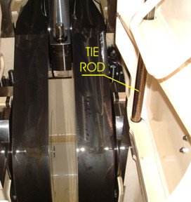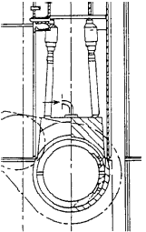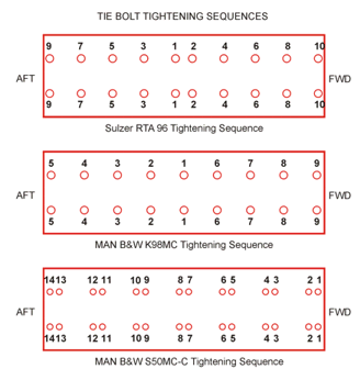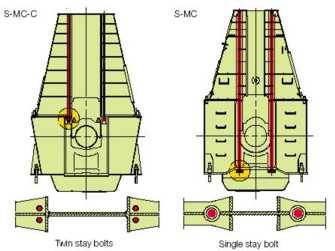 On the MAN B&W MC-C engine the tie bolts do not pass through the bedplate transverse girder in the traditional way. Instead there are two pairs of tie bolts fitted either side of the single plate A frame and screwed into the bedplate transverse girder. This, it is claimed, reduces the distortion of the bedplate during engine operation.