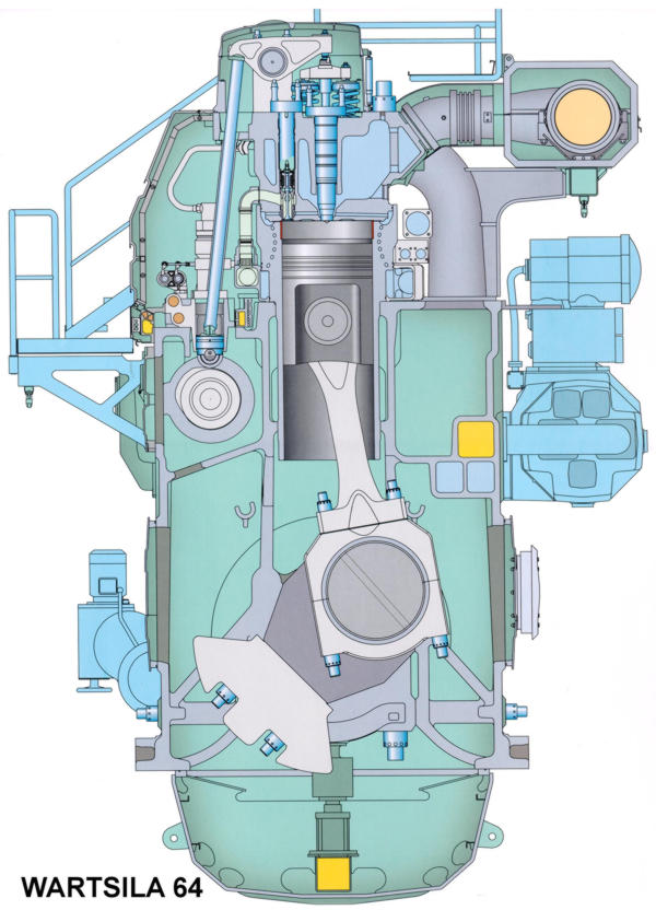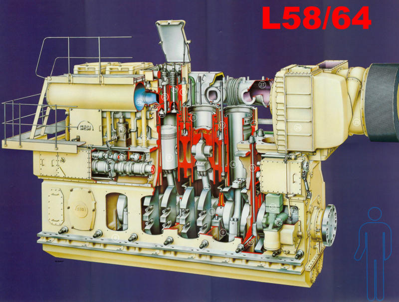 The MAN B&W L58/64 engine Bore: 540mm Stroke: 640mm. Speed: 428rpm. Power output: 1390kW/cyl. Specific fuel consumption: 177g/kWh. Mass of 6 cyl engine: 151 tonnes, 9 cyl engine: 213 tonnes.
