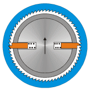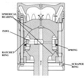 Pistons for medium speed trunk piston engines which burn residual fuel are composite pistons; i.e the crown and the skirt are made of different materials. The crown is a heat resisting steel forging which may be alloyed with chromium, molybdenum and nickel to maintain strength at high temperatures and resist corrosion. It is dished to form a combustion chamber with cutouts to allow for the valves opening. The topland (the space between the top ring and the top of the piston) may be tapered to allow for expansion being greater where the piston is hottest. The skirt can either be a nodular cast iron or forged or cast silicon aluminium alloy. Aluminium has the advantage of being light, with low inertia, reducing bearing loading. However because aluminium has a higher coefficient of expansion than steel, increased clearances must be allowed for during manufacture. This means that the piston skirt clearance in the liner is greater than that for cast iron when running at low loads. The skirt transmits the side thrust, caused by the varying angularity of the con rod, to the liner. Too big a clearance will cause the piston to tilt. The piston pin for the con rod small end bearing is located in the piston skirt. The piston pin floats in the piston skirt and is located in place by circlips. Depending on the material used for the skirt (esp. cast aluminium), a bushing may be used for the pin. The piston rings may be located in the crown or in both crown and skirt. Normally, the rings are chrome plated or plasma coated to resist wear. Because the liner is splash lubricated, an oil scraper (oil control) ring is fitted to the piston skirt. The piston is oil cooled. This is achieved by various means; The simplest is for a jet of oil to be directed upwards from a hole in the top of the con rod onto the underside of the crown. A more efficient method is to use an oil catcher as shown in the picture above. This directs oil into the cooling spaces on the underside of the crown where the cocktail shaker effect of the reciprocating piston ensures a positive cooling effect. It is unusual for the oil return temperature to be monitored (unlike the 2 stroke slow speed crosshead engine, where both temperature and quantity are monitored). Some engines are fitted with one piece pistons manufactured from either cast iron or silicon alloy aluminium . These cannot be used with residual fuel, because the higher temperatures causes burning of the piston crown. Aluminium also suffers from carbon build up above 300º C. Ring grooves in aluminium pistons usually take the form of a chrome plated cast iron insert. The Rotating Piston
